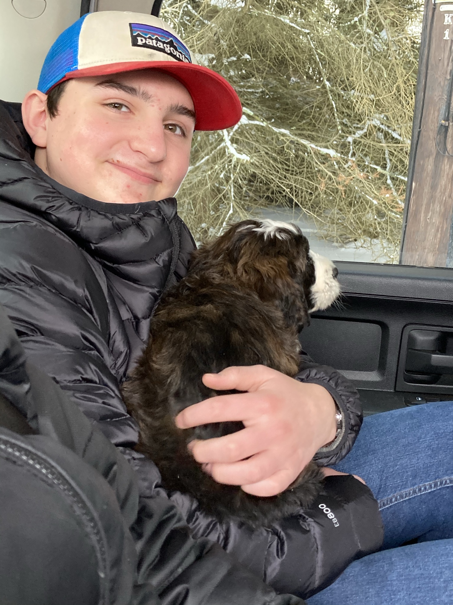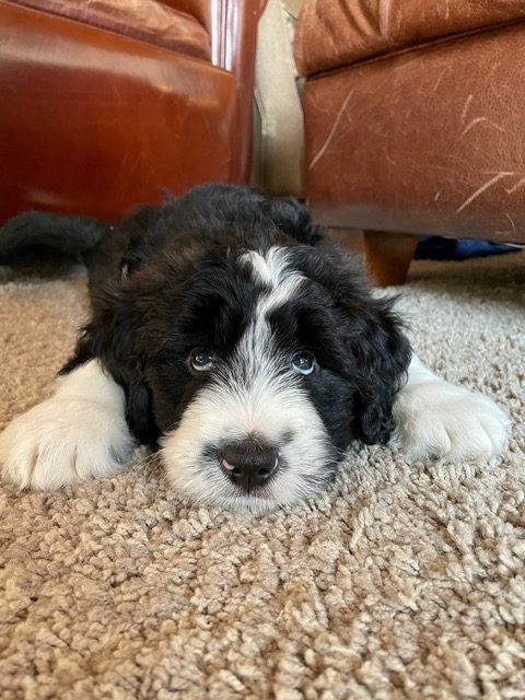 “Here are some pictures of Bodhi, one of your Bernese Water Pups, who is about 5 months old now. This guy is a lean 43 lbs. He is totally content doing whatever, as long as he is around the family. He is already out of the crate at night. He is very smart and has learned several commands very well. My son thought Bodhi had something in his mouth that should not have been there, so he told him to “drop it” and out came a dog treat I had just given him. Bodhi even waited for permission to pick it back up! Couldn’t ask for a better addition to the family!”